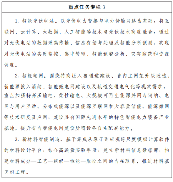 (三)新能源新材料产业智能提升工程。加快建设智能风电场、智能光伏电站等设施及基于互联网的智慧运行云平台,大力普及智能化用能监测和诊断技术,着力构建以智能电网为基础,与热力管网、天然气管网、交通网络等多种网络互联互通,多种能源形态协同转化、集中式与分布式能源协调运行的综合能源网络。大力发展形状记忆合金、自修复材料、智能仿生材料、智能传感材料等新兴功能材料,拓展云计算、人工智能等技术在新材料研发中的应用。