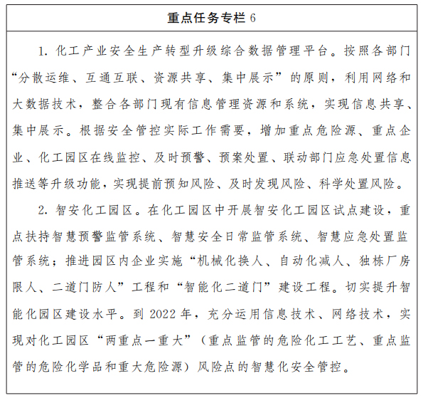 (六)高端化工产业智能提升工程。建设全省化工产业安全生产转型升级综合数据管理平台。推进智能工厂建设,实现生产制造、装置管理、安环监控、仓储物流、采购销售、运营管理等全流程智能化。推进智安化工园区建设,对园区内化工企业生产、储存、流通和废物处理等环节加强监控与数据共享,对重点监管的危险化工工艺、危险化学品以及重大危险源实施智能化监控。