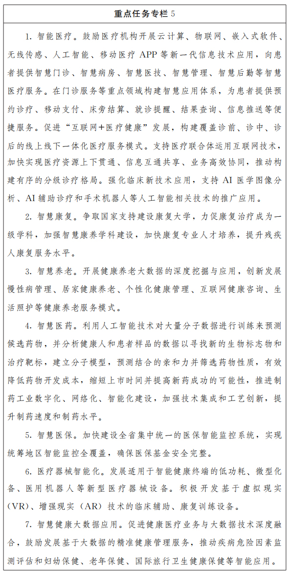 (五)医养健康产业智能提升工程。加快推广人工智能治疗新模式新手段,探索建设智慧医院。研发人机协同临床智能诊疗方案,基于人工智能开展新药研发,推进医药监管智能化。加强流行病智能监测和防控。推动健康管理实现从点状监测向连续监测、从短流程管理向长流程管理转变。建设智能养老社区和智能化养老设施,拓展老年人活动空间,搭建面向老年人的移动社交与服务平台。