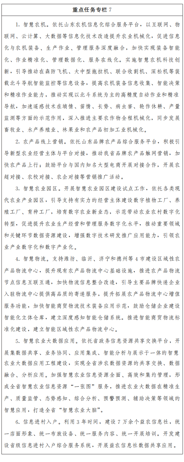 (七)现代高效农业智能提升工程。大力开发农业智能传感与控制系统、智能化农业装备、农机田间作业自主系统,提升农业生产精准化、智能化水平。探索开展智能化农场、牧场、渔场、果园、农产品加工车间、农产品绿色供应链。搭建天空地一体化智能农业信息遥感监测网络,建立典型农业大数据智能决策分析系统,提高农业宏观调控的科学性、预见性和有效性。加快推动信息进村入户,为农民提供便捷高效服务。