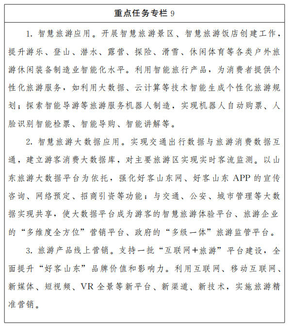 (九)精品旅游产业智能提升工程。开展智慧旅游景区、智慧旅游饭店创建工作,完善旅游信息公共服务体系,建设集导游、导览、导航、导购等功能为一体的公共服务平台。加快建立山东旅游大数据平台,提高预测预警、应急处置、舆情监控等水平。