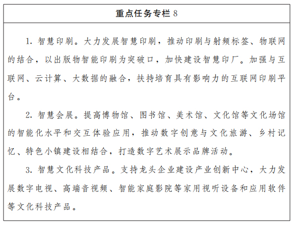 (八)文化创意产业智能提升工程。鼓励基于虚拟现实、增强现实、全息成像、裸眼3D、沉浸式体验平台、互动影视、智能语音等新技术、新装备创作数字文化作品和产品。适应互联网、智能终端传播特点,加强大数据挖掘与加工,提供个性化文化服务。鼓励开发聊天机器人、撰稿机器人、会议记录机器人。支持建设网络创意设计服务平台,开展众创生产。