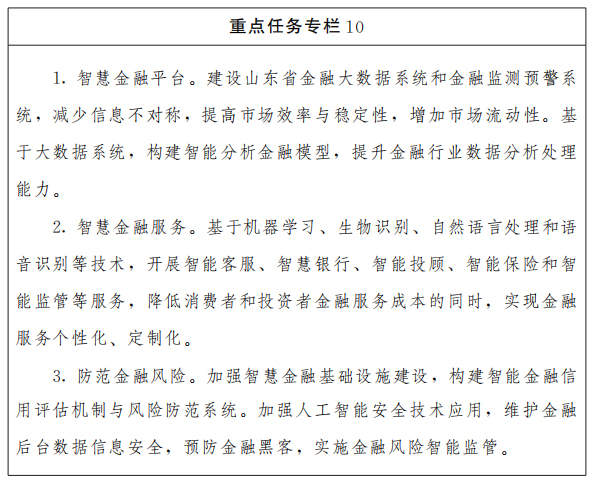 (十)现代金融产业智能提升工程。鼓励利用大数据、量子通信、人工智能等进行金融业务流程再造、产品创新和风险控制。创新智能金融产品和服务,发展金融新业态。鼓励金融行业应用智能客服、智能监控等技术和装备。建立金融监测预警系统。
