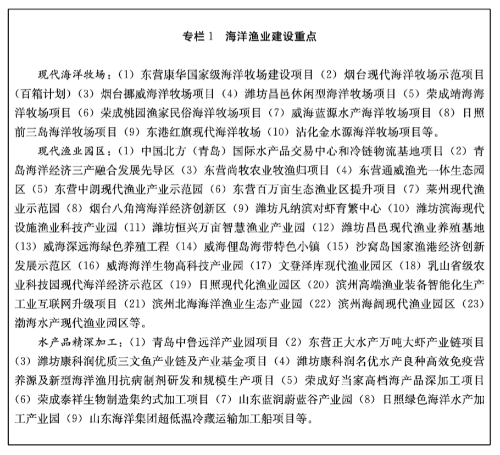 加快现代海洋牧场建设。以加强海洋生态环境修复、开展生物资源养护、推进产业融合为目标,突出生态优先、资源修复优先,提升人工鱼礁的亲生物性能,实现渔业生境的有效恢复。以青岛、烟台、威海、日照等为重点,高水平建设国家海洋牧场示范区。积极探索三产融合型海洋牧场综合体发展新模式,推动海洋牧场与海工装备、海上风电、休闲旅游等产业融合发展。