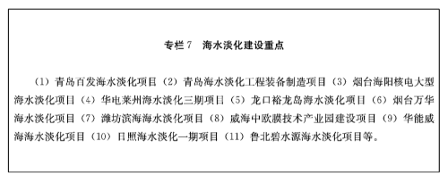 推动海水淡化全产业链协同发展。在青岛、烟台建设具有辐射供水功能和全产业链的综合性产业园。加快突破关键核心装备制造瓶颈,提升装备集成能力和制造水平。推动海水淡化浓海水中化学元素提取技术升级,鼓励从浓海水中提取钾、溴、镁等产品,提高产品附加值,推动海水淡化相关产业融合发展。