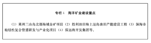 4.海洋矿业。提高海洋油气资源自主勘探能力,建设海洋油气资源开发与综合保障基地。积极推进渤海油田及凝析油、凝析气勘探开采,就近登陆东营、滨州等地加工转化。开展部分典型海域海底生态地质调查、海岛海湾综合地质调查,获取海洋地质基础数据,合理开发海滨砂矿、海底煤矿、金矿等矿产资源。研究突破海底资源勘查及开发关键技术,力争深海空间探测与作业技术达到国际领先水平。探索组建深远海开发集团,开展深远海矿产能源勘探开采、深海空间开发利用等。(省发展改革委、省科技厅、省工业和信息化厅、省自然资源厅、省国资委、省能源局按职责分工负责)