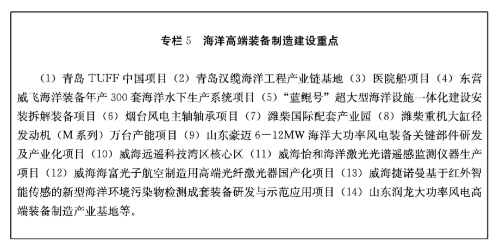 着力打造海洋高端装备产业集群。培育壮大具有国际竞争优势的龙头企业、专业化配套企业,强化自主设计、系统集成和总承包能力,提升产业集聚发展水平。青岛建设综合性海洋装备制造基地、东营建设海洋石油装备产业基地、烟台建设中国海工装备名城、潍坊建设海洋动力装备制造基地、威海建设海洋装备制造基地、日照建设高端海洋装备用钢基地、滨州建设海洋新能源装备产业基地。