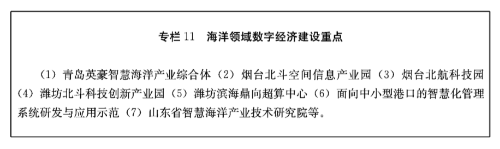 提高海洋产业数字化水平。实施智慧海洋工程,加快现代信息技术同海洋产业的深度融合,积极运用大数据、云计算、人工智能等新一代信息技术赋能海洋产业发展。加快培育海洋产业新技术、新产业、新业态和新模式,大力发展智慧渔业、智能制造、智慧港口、智慧航运、智慧旅游等“智能+”海洋产业。支持山东省智慧海洋产业技术研究院建设,以绿色、智慧海洋产业发展为重点,推动智慧海洋产业高效率、高质量发展。提升产业链供应链资源共享和业务协同能力,推进海洋产业园区智慧化改造。