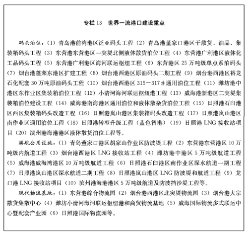 推进港口一体化协同发展。深化港口一体化改革,通过资本运作、项目合作、混合所有制改革等方式,加快沿海港口及相关资源整合,加快推动向枢纽港、贸易港、金融港升级,促进港口间合理分工、错位发展。重点推进青岛港董家口港区、日照港岚山港区、日照港石臼港区、烟台港西港区等港区建设,统筹有序发展渤海湾港口和威海港,打造国际航运服务基地、大宗商品储运交易加工基地。优化口岸营商环境,建立口岸单位协调机制,创新监管模式,提高港口航道通航效率,打造国内效率最高效、通道最便捷、成本最经济的海洋港口。
