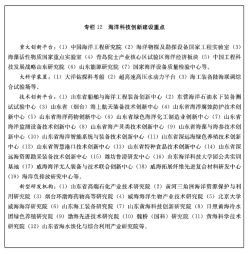 1.海洋高端装备制造。面向深海大洋资源开发,加快推进核心设备国产化、智慧化,推动形成覆盖科研开发、总装建造、设备供应、技术服务的全产业链体系,打造“山东海工”区域品牌,建设世界领先的现代海工装备制造基地。