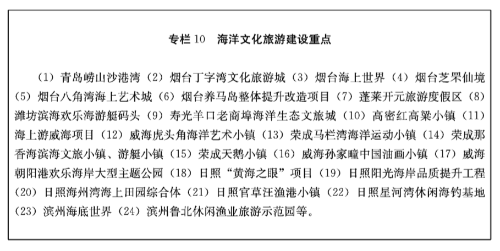 1.海洋文化旅游。坚持海陆统筹、城海一体、山海融合,着力提升优质文旅产品供给能力和智慧化服务水平,建设一批特色旅游线路、标志性景区和精品项目,串珠成线、连片成面,建立滨海、近海、远海有机结合的海洋旅游产品体系,打造海洋文旅融合发展高地、世界著名的“仙境海岸”滨海旅游胜地。